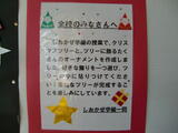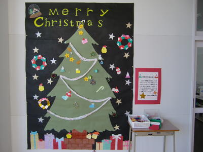 職員室前廊下に大きなクリスマスツリーが飾られました。これは、しおかぜ学級の皆さんが授業の中で作成したものです。ツリーに飾るオーナメントもたくさん作成してくれました。「ツリーの中にオーナメントを自由に張り付けてほしい」という、全校生徒への呼び掛けがツリー横に掲示されています。早速、張り付けた生徒たちがいます。完成が楽しみです!!