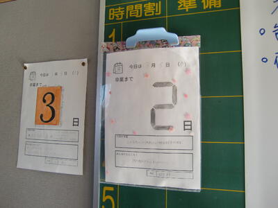 3年生の教室に、「卒業まであと2日」の掲示物が・・・。