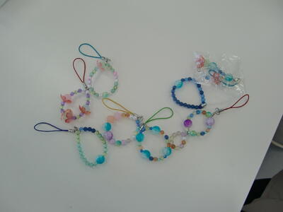 なんと、生徒たちの手作りでした。自分たちの好きな大きさ、好きな色のビーズをつなぎ合わせたそうです。最後に、透明な袋に入れて完成でしたが、まるでお店で売っている商品のような仕上がりでした。