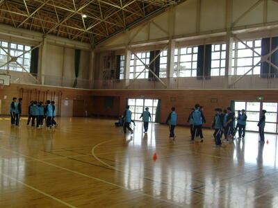 5校時目に、体育館から楽しそうな声が聞こえてきたので行ってみると・・・1学年がドッジボールを行っていました。円陣を組んで、足で音を鳴らして気合いを入れている様子が見られました。ルールを再確認する声もあがっていました。