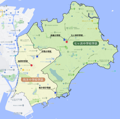 本校は、丘陵性の半島、七ヶ浜町のほぼ中央に位置し、東南は太平洋、北は松島湾、西は貞山運河に囲まれた景勝の地にあります。七ヶ浜町は、東北地方で一番面積が小さな町で、海沿いに7つの集落があったことから「七ヶ浜」と名づけられました。7つの集落とは湊浜、松ヶ浜、菖蒲田浜、花渕浜、吉田浜、代ヶ崎浜、東宮浜です。