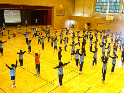週末の体育祭まであと5日。全校生徒が、赤と青に分かれて本格的に練習を始めました。結団式に続き、「応援合戦」の動きを3年生幹部が1・2年生に指導しました。応援合戦では、「勝つこと」を目標に、集団で声や体の動きを合わせ、表現することを通して、七中のの一員であるという自覚と誇りをもってほしいと思います。