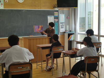 ボランティアさんによる「読み聞かせ」も4回目となりました。今日は、しおかぜ学級で行われました。これまでは、実物投影機を使って本を画面に映していましたが、今日は本を見ながら読み聞かせを行っていただきました。生徒たちは真剣に聞いていました。