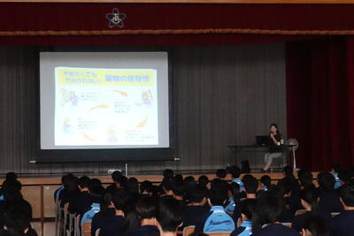全校生徒を対象に薬物乱用防止教室を開催しました。今回は塩釜警察署生活安全課の方を講師にお招きし、薬物乱用防止についてご講演いただきました。