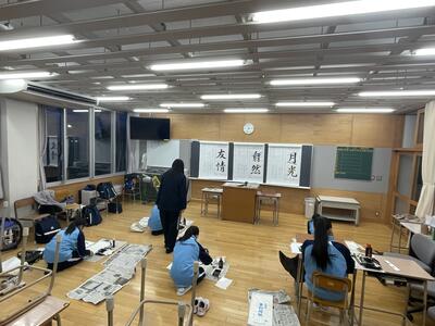 県書きぞめ展覧会出品に向けて、希望者による放課後書きぞめ練習会を今週行っています。1年生は「月光」2年生は「自然」3年生は「友情」という課題です。生徒は静かな環境で集中して練習していました。今日のニュースによると「文化庁は、筆や墨などを使って、伝統的な筆遣いで手書きする「書道」を、ユネスコの無形文化遺産に提案することを決めました。」とあります。書道は日本の文化で世界に誇れるものなのだなあと思いました。
