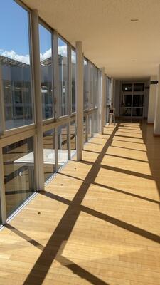 教室内はエアコンで涼しいのですが本校はガラス張りの校舎、廊下はとっても暑いです。