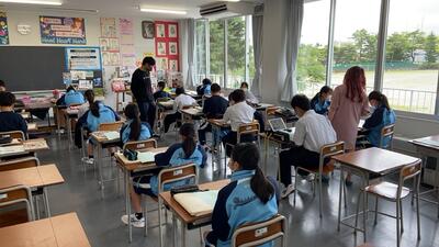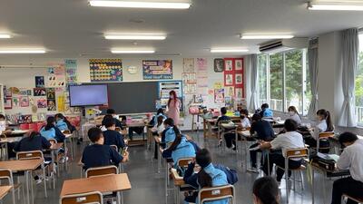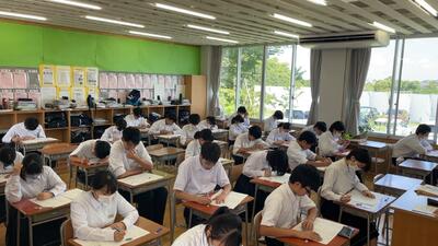 34日間の長く暑い夏休みが終わり今日から授業です。今日は、熱中症アラートが出ていますが、生徒はエアコンの効いた教室で5教科の実力テストに取り組んでいます。