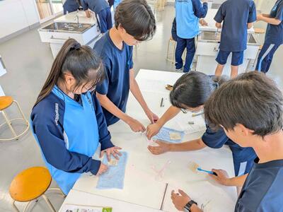 家庭科の授業で、2年生が歯ブラシを使ったしみ抜きに挑戦しました。重曹や液体洗剤をつけた歯ブラシでトントン叩くと、みるみる汚れが薄くなっていきます。みんな、しみが落ちる様子に驚きながら、熱心に取り組んでいました。ご家庭でも、ぜひ試してみてくださいね。