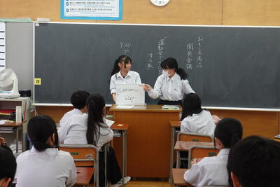 2年生の国語の授業で、「運動会で大活躍する靴」をテーマに商品開発のグループ発表が行われました。生徒たちは、話合いを通して独創的なアイデアを出し合い、機能性やデザインにこだわったオリジナルの靴を考案し、発表しました。生徒たちの豊かな発想力と、協力して課題に取り組む姿勢が見られた素晴らしい発表会となりました。