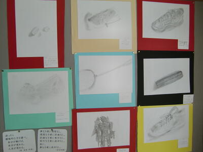 1年生が美術の時間に制作したデッサン画が廊下に掲示されました。普段使っている筆入れや消しゴムなどの文房具類、部活動で使っているシューズやラケット、お気に入りの物など、いろいろな物が作品に登場しています。作品にはコメントが付いていて、制作時の大変さ(難しかった 等)が書かれています。中には、「これからも筆入れを大事に使いたい」「皆さんは〇〇を知っていますか?」というコメントもありました。