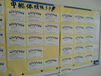 仙台北地区中学校総合体育大会まで、あと11日となりました。廊下には3年生作成の、中総体に向けたメッセージが掲示されています。ここには、大会への意気込みや運動部の仲間に向けた応援等が書かれています。部ごとに使える連絡ボードにも、生徒たちの様々な思いが書かれています。