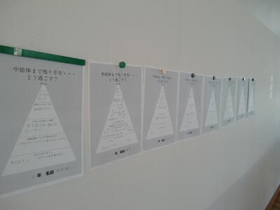 多目的室の壁に、男子バスケットボール部の掲示物を発見しました。「中総体まで残り半年・・・どう過ごす?」というもので、5月実施予定の中総体での個人目標が書かれています。その目標の下には、上から順に「必要なスキル・モノ」「そのための新しい習慣」「短期目標」「今すぐやるべきこと」が記載されています。登下校の際には車に頼らず歩いて体力を付けたいなどと、生徒それぞれが考えて書いています。